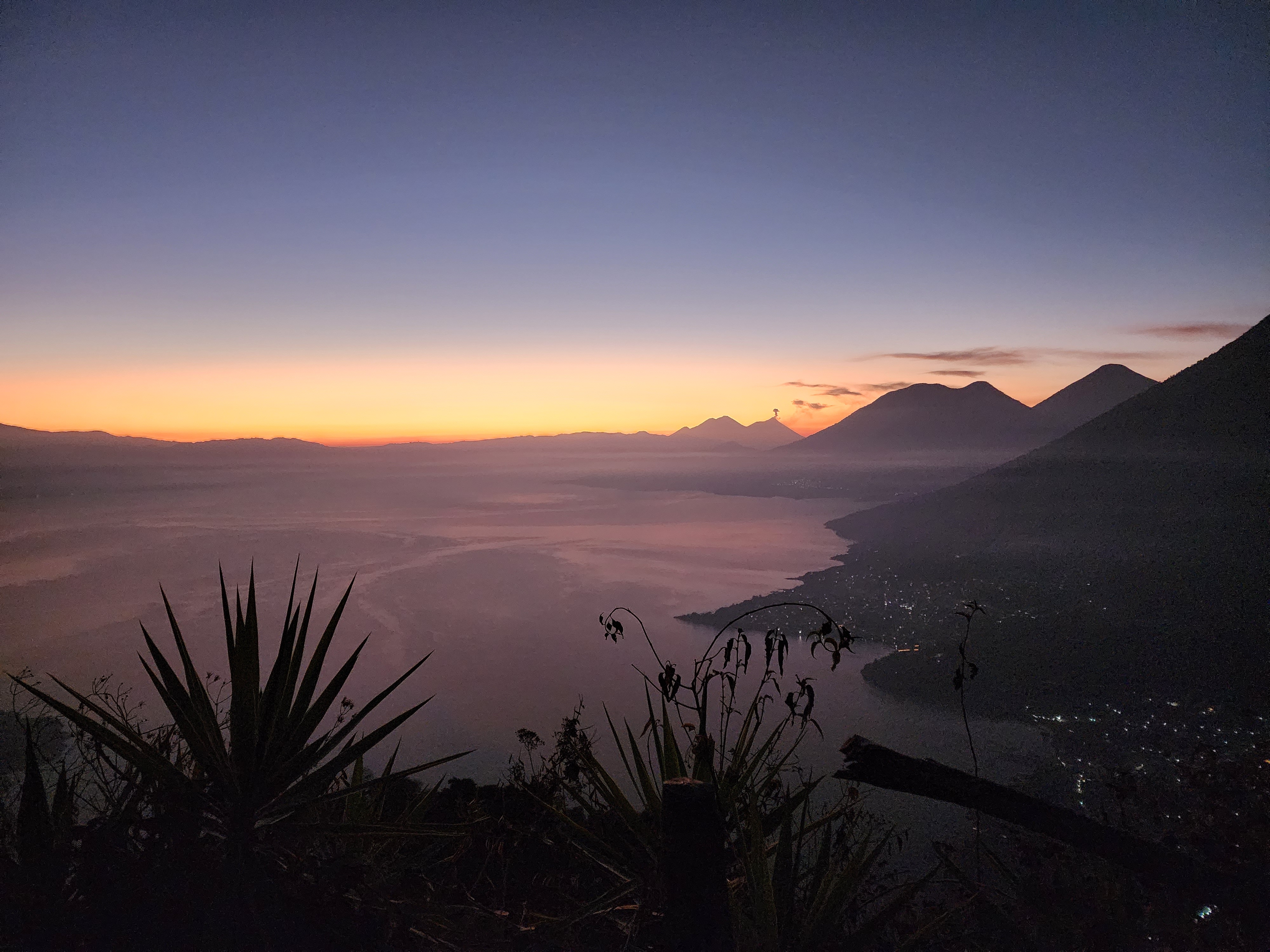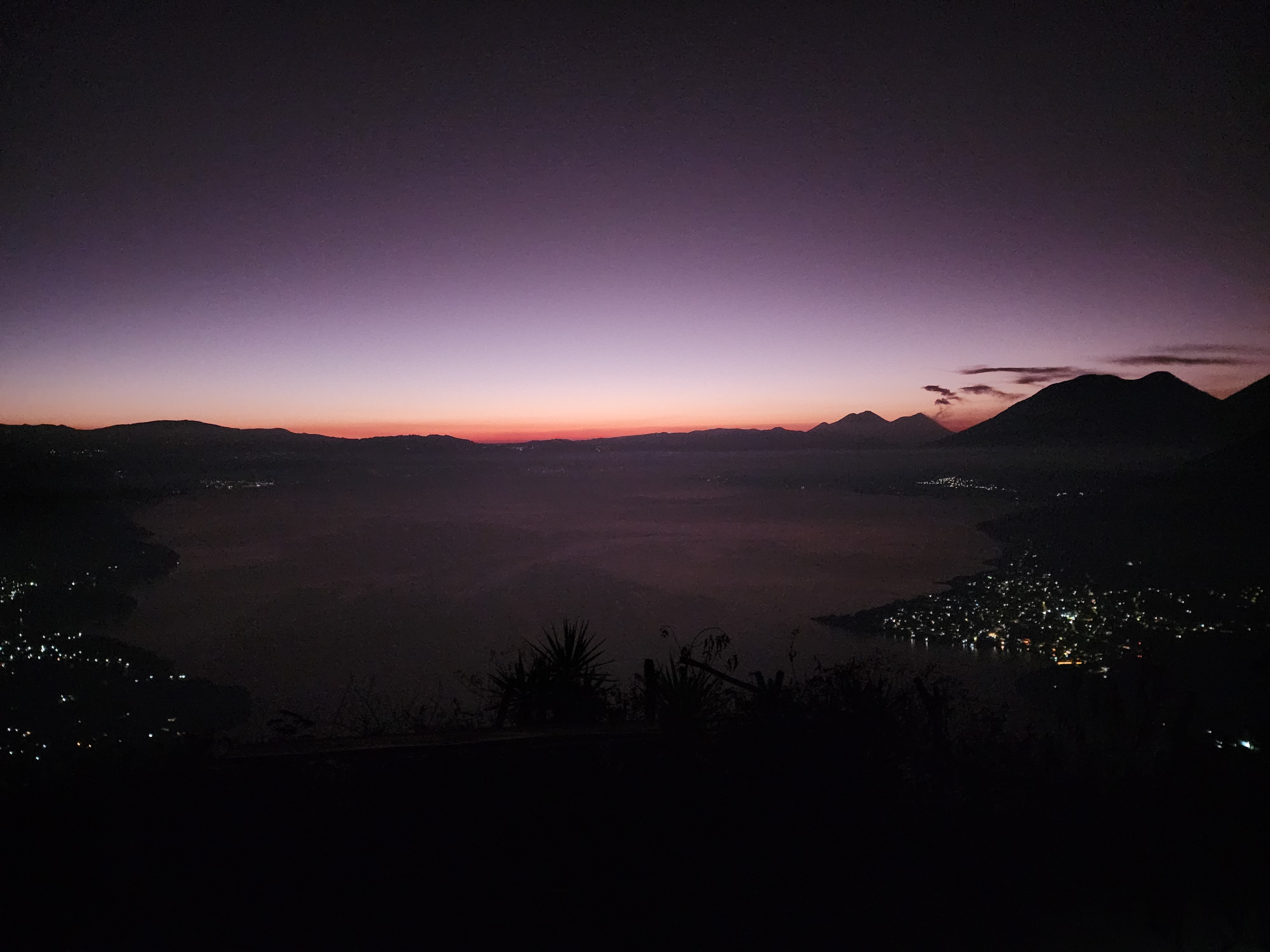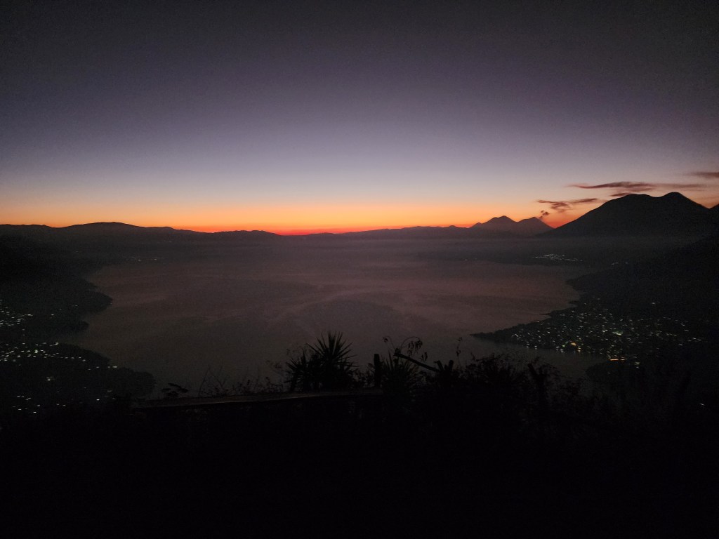 With the moonlight being blocked by dense trees, we used either headlamps or our phones (depending on how well prepared you were) to hike a relatively easy 25 minutes to our viewpoint. I say “our” because they’re a few viewpoints along the ridge of the “nose”, we were on the middle viewpoint. It was still pitch black when we arrived, with the only light being the slight glows from the lakeside villages. All of a sudden, another light exploded into view, quite literally. It was distant Volcan Acatenango erupting, and the red hot glowing lava was visible all the way from the lake. It was an absolutely incredible sight!! But that was only the beginning. Shortly after, a tiny slither of magnificent violet crawled over the mountains and into sight.