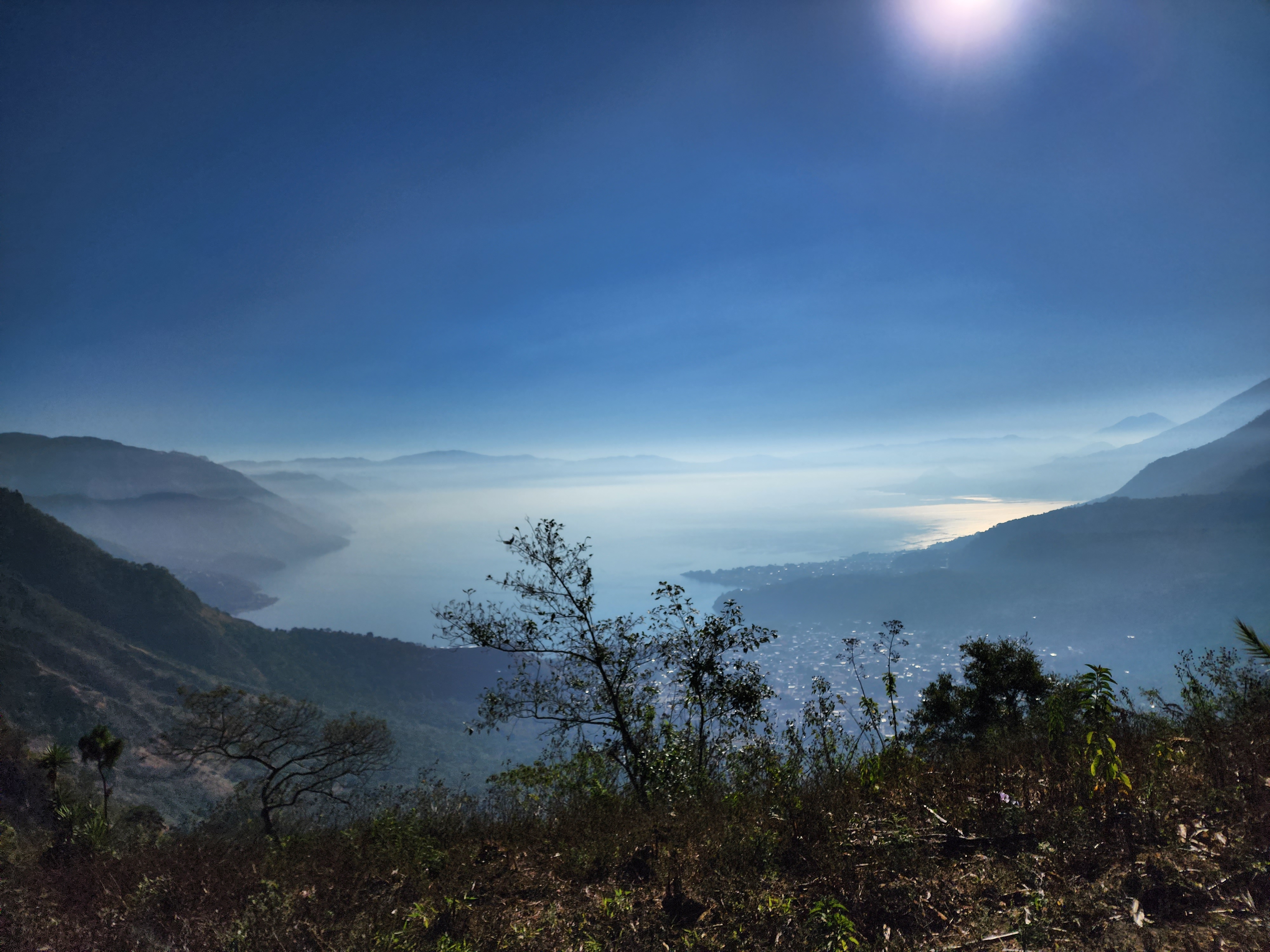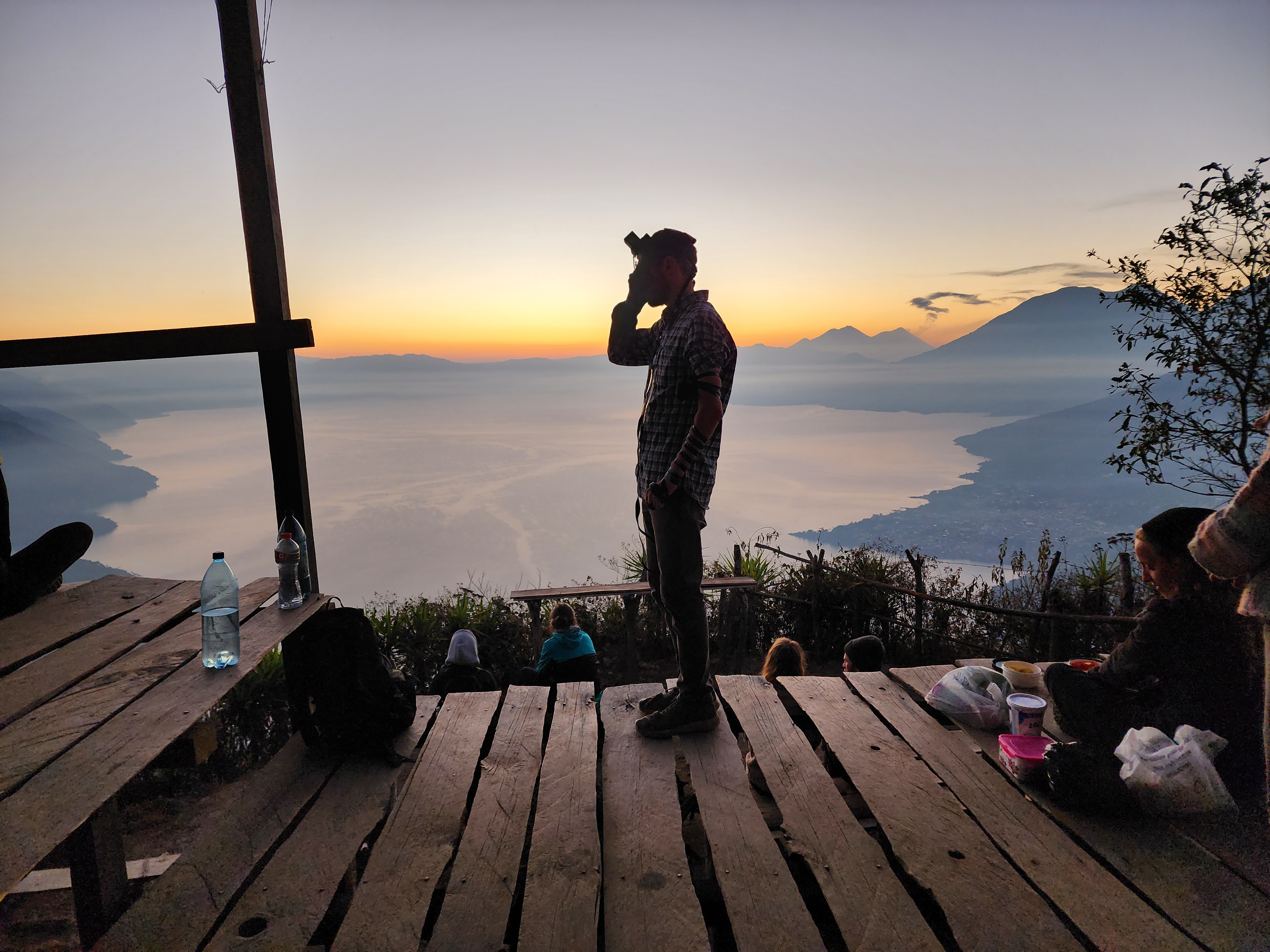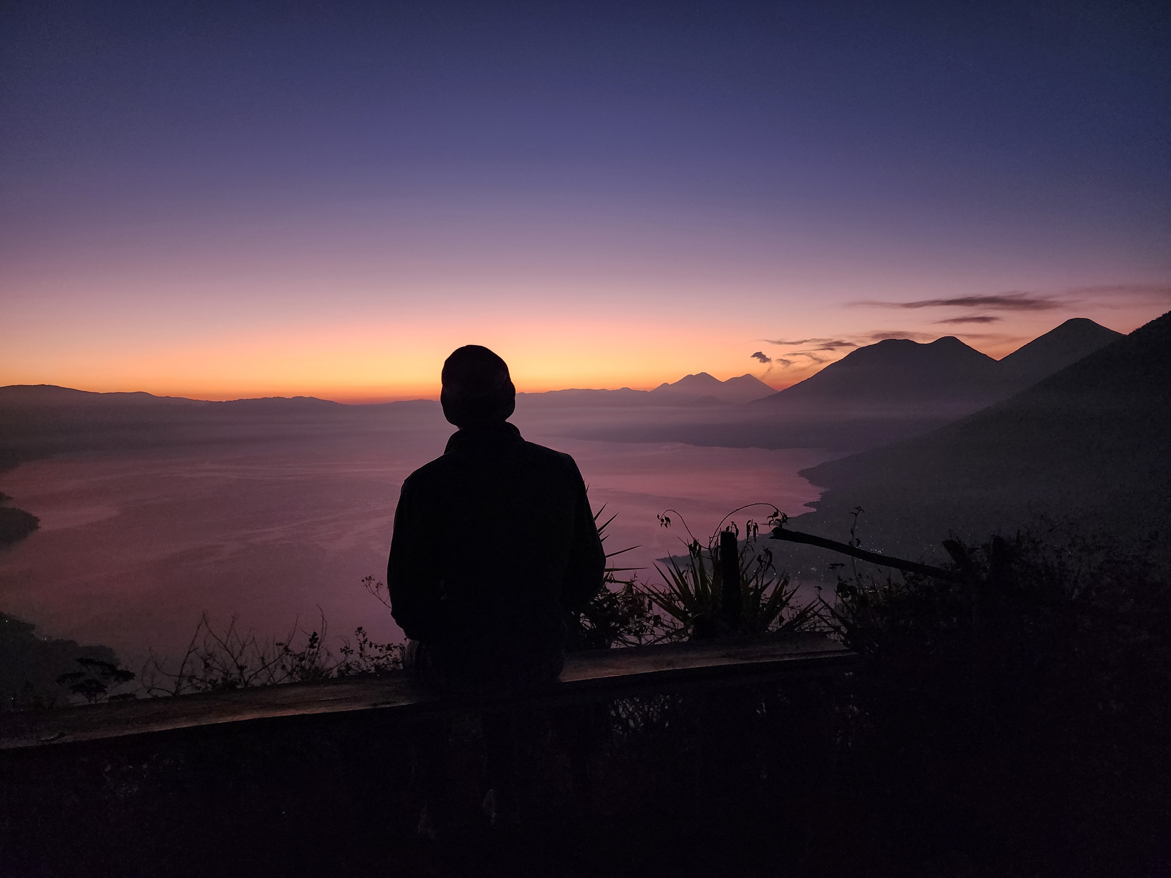 With the moonlight being blocked by dense trees, we used either headlamps or our phones (depending on how well prepared you were) to hike a relatively easy 25 minutes to our viewpoint. I say “our” because they’re a few viewpoints along the ridge of the “nose”, we were on the middle viewpoint. It was still pitch black when we arrived, with the only light being the slight glows from the lakeside villages. All of a sudden, another light exploded into view, quite literally. It was distant Volcan Acatenango erupting, and the red hot glowing lava was visible all the way from the lake. It was an absolutely incredible sight!! But that was only the beginning. Shortly after, a tiny slither of magnificent violet crawled over the mountains and into sight.