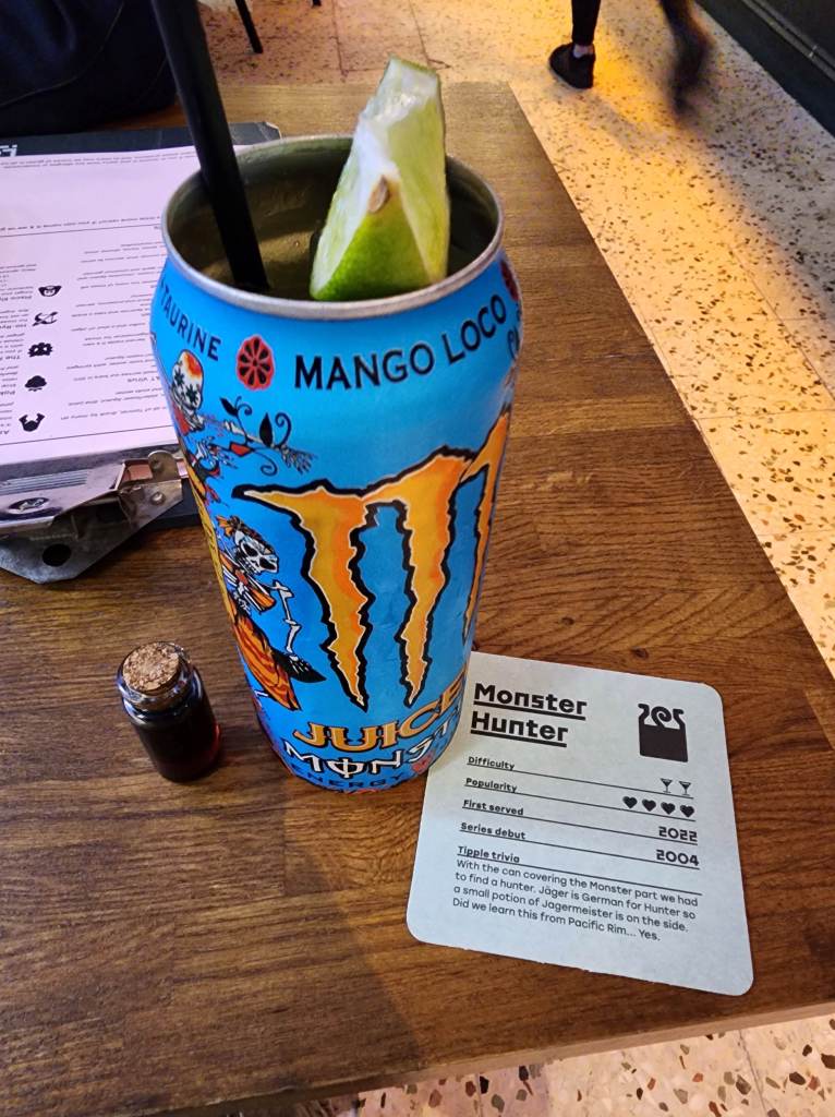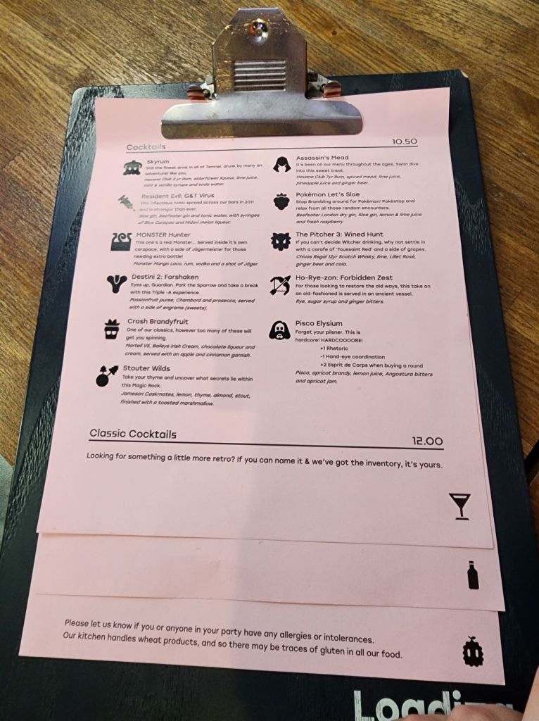 Cost: There’s no charge to play games, so long as you purchase something. There’s a large drinks menu, including a selection of video game themed cocktails (I absolutely recommend the MONSTER Hunter!), so lick your lips and roll that six!
